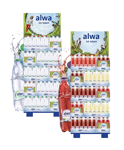 Passend zu den neuen 0,5l PET-Einwegflaschen gibt es ein neues, aufmerksamkeitsstarkes alwa-Display für den Point of Sale. "Mit dem neuen Palettenmantel und einer Flasche in 3D-Optik erhöhen wir die Wiedererkennung der Marke alwa, schaffen Breitenwirkung und visualisieren die Frische unserer Produkte", gibt Gerhard Kaufmann bekannt. (verfügbar ab Ende März/Anfang April)